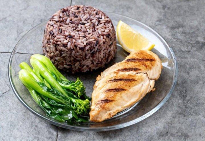 我的减脂午餐示例:午餐=1拳头糙米饭+1份清炒西兰花+1份香煎鸡胸肉。